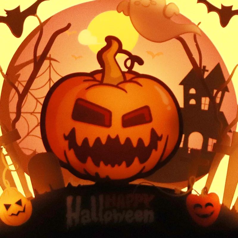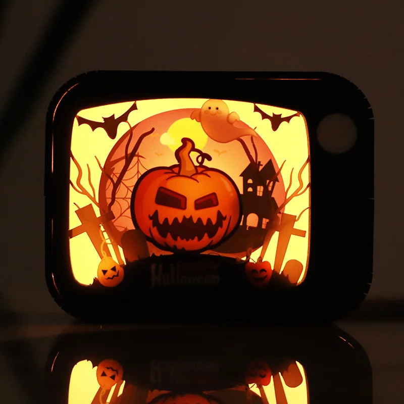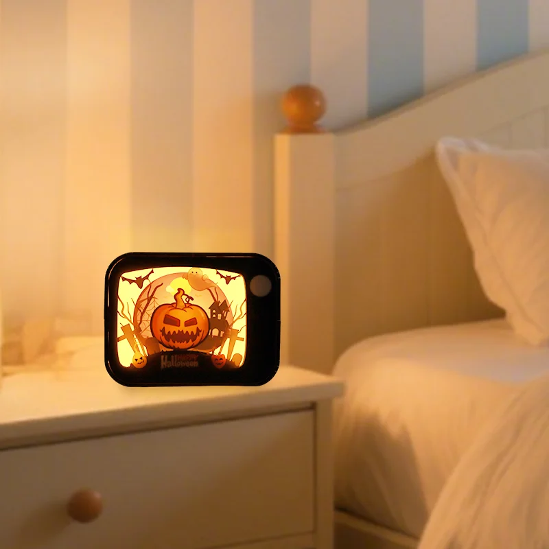 Halloween-Holzschnitzerei mit LED-Nachtlicht, Kürbis-Thema, Holzdekoration, gruselige Atmosphärenlampe für die Festtagsdekoration, Geschenkidee